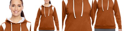 BODY: 7.5 oz., 100% polyester interlock double knit; LINING: 100% polyester tricot large hole mesh lining in hood; Peached finish on interior for added comfort in hood; Contrast inserts at front shoulders; Zippered front welt pockets; Flat White 3/8" drawcord; 2½" 1x1 rib-knit hem and cuffs;