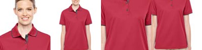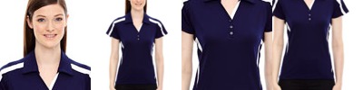 4.13 oz./yd² / 140 gsm, 100% polyester piqué with moisture-wicking, anti-microbial, and UV protection performance; Matching flat-knit collar with contrast tipping; Three-button collar with contrast inner detail; Narrow placket for feminine look; Matching knit cuffs with contrast tipping; Side slits;