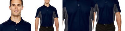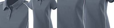 100% polyester snag protection plus tricot, 5 oz./yd2/170 gsm; Moisture wicking, antimicrobial and UV protection performance; matching flat knit collar; contrast colour neck tape; contrast inner placket; contrast side inserts; contrast piping at front and back shoulders and sleeves; contrast two-needle decorative stitching;
