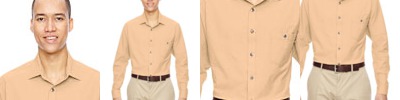 4.4 oz., 100% two-tone polyester; moisture-wicking performance; contrast coverstitch details ; structured collar stand with integrated collar stays; back yoke; adjustable cuffs; back waist darts;