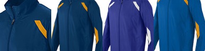 2.8 oz., abrasion-resistant 100% nylon taslan shell with polyurethane coating for enhanced wind- and water-resistance; 2.95 oz., 100% polyester dyed-to-match tricot big hole mesh lining in body; 1.7 oz., 100% polyester taffeta lining in sleeves; roll-away three-piece hood with 1¼" rain bill; Black 3/8" taping adds contrast to back and sleeves; EZEM zipper in back lining for easy decoration access; center front/lower pockets with molded plastic zipper with garage;
