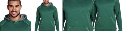 Shell: 7.08 oz/yd2 / 240 gsm, 100% polyester mélange fleece with moisture wicking performance; Lining: 100% polyester tricot in hood; Self fabric cuffs with thumbholes; Hand warmer pouch pocket; Contrast coverstitch details throughout;