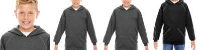 100% polyester brushed back fleece, 7.4 oz./yd2/250 gsm; Moisture wicking performance; Spandex enhanced matching rib cuffs and waistband; Front hand warmer pouch pocket; Coverstitch details at hood, raglan, sleeves and pocket opening;
