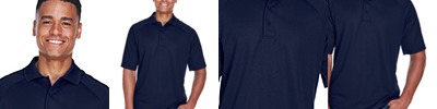 4 oz., 100% polyester tricot; snag protection; moisture-wicking performance; anti-microbial; UV protection performance; heat-sealed label; three-button placket; contrast shoulder inserts; Y-neck with matching flat knit collar;