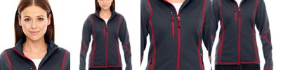 100% polyester with 100% polyester fleece, 8.3 oz./yd2/280 gsm ; inside storm placket with chin guard; centre front contrast reverse coil zipper; stretch storm cuffs with thumb holes; right chest and front lower pockets; contrast coverstitch details; audio port access through inside left pocket;