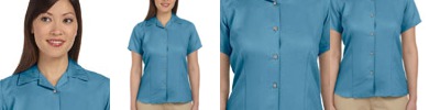 100% polyester two-tone interlock, 4.3 oz./yd2/145 gsm; Quick Dry, moisture wicking and UV protection performance; self fabric binding at shoulders and side seams; metal rivet details above side slits; heat seal label ; y-neck with self-fabric collar and partial collar stand; concealed snap placket with exposed metal snap at top;